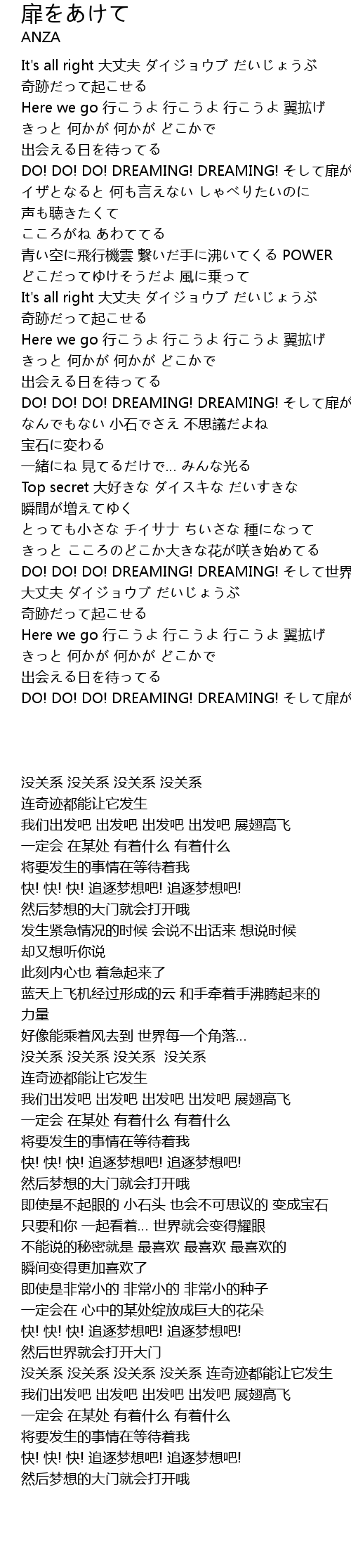 | [00:31.55] | DO! DO! DO! DREAMING! DREAMING! そして扉がひらくよ |
