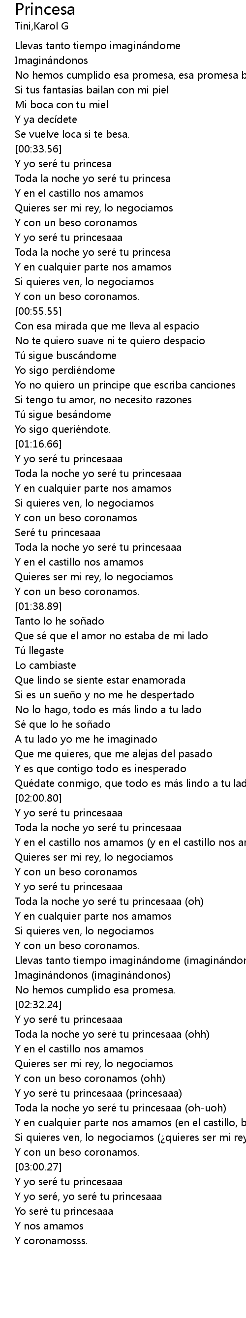| [01:30.22] | Toda la noche yo seré tu princesaaa |