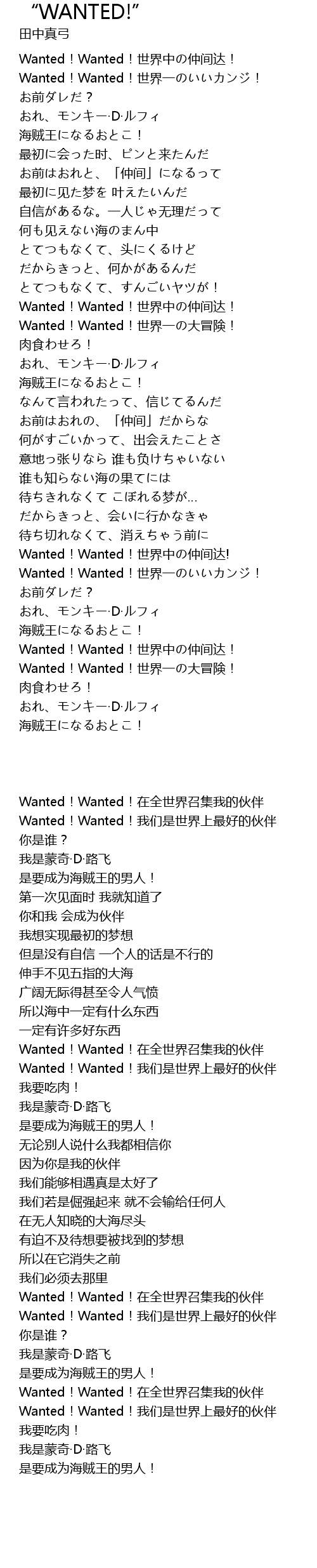 | [03:32.480] | Wanted! Wanted! shì jiè yī dà mào xiǎn! |