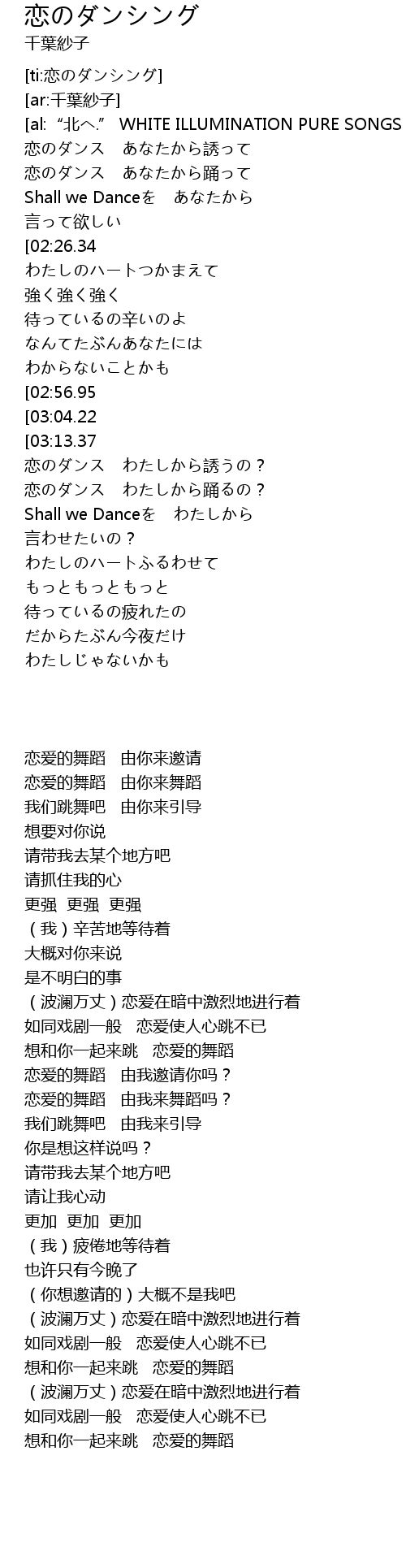 | [01:36.92][03:13.37][03:51.58] | あなたと踊りたい 恋のダンシング |