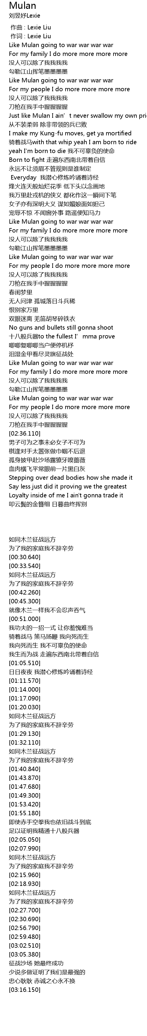 | [02:11.010] | Like Mulan going to war war war war |