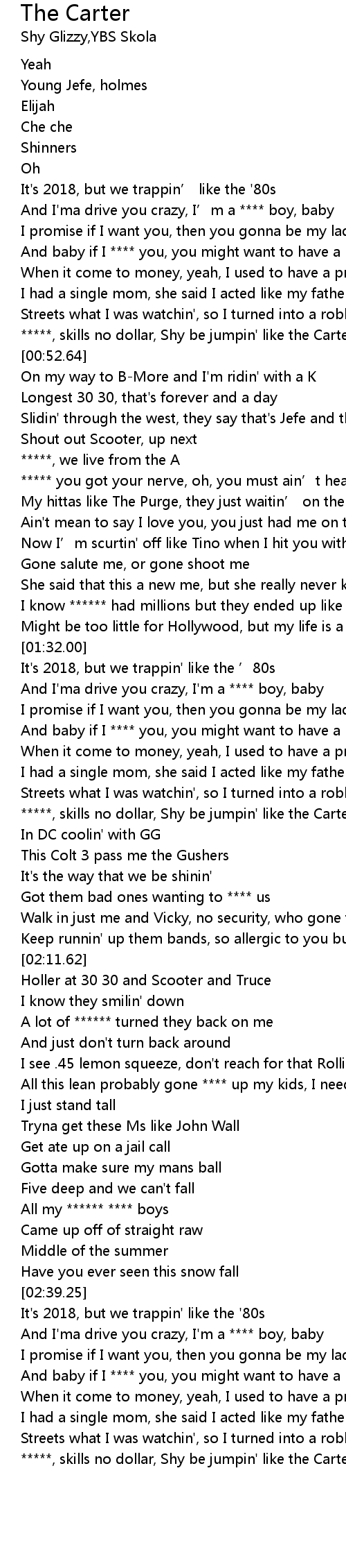 | [01:55.25] | *****, skills no dollar, Shy be jumpin' like the Carter, uh |