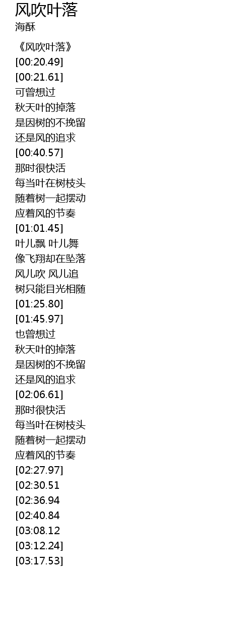 | [02:51.32][02:30.51] | 叶儿飘 叶儿舞 |