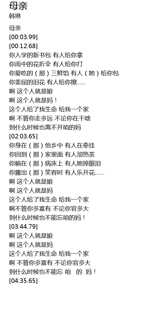 | [03:35.37] | 到什么时候也不能忘咱的妈! |