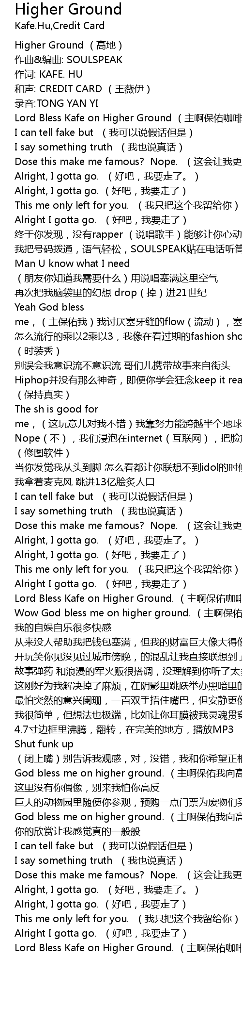 | Lord Bless Kafe on Higher Ground zhǔ a bǎo yòu kā fēi xiàng gāo chù xíng | |