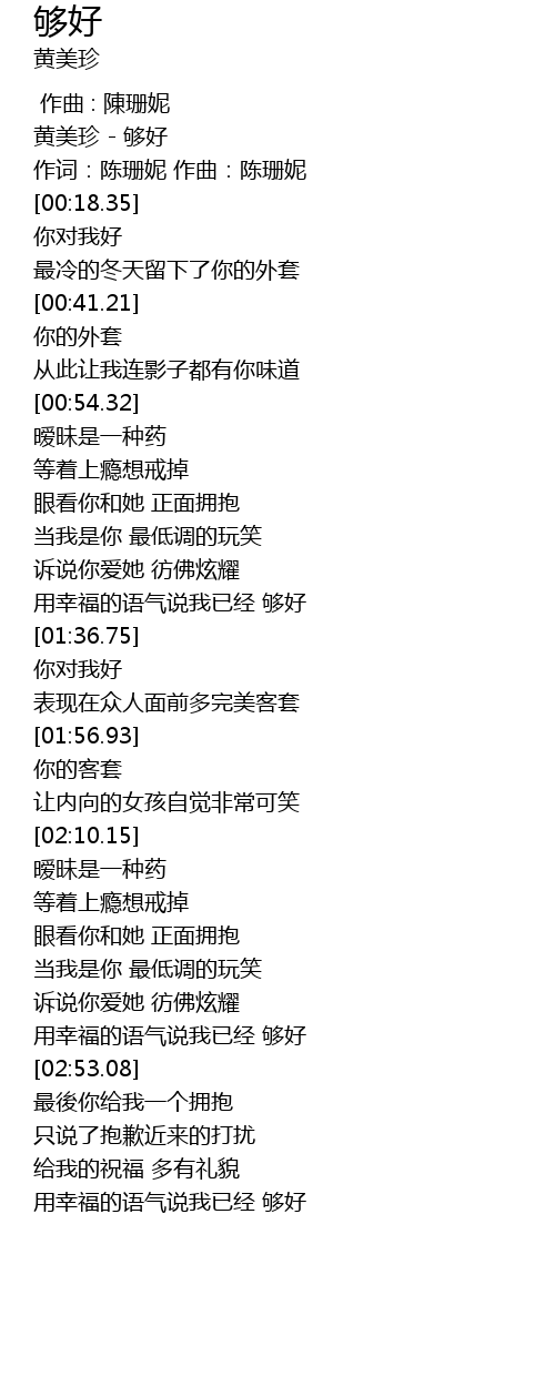 | [01:26.98] | 用幸福的语气说我已经 够好 |
