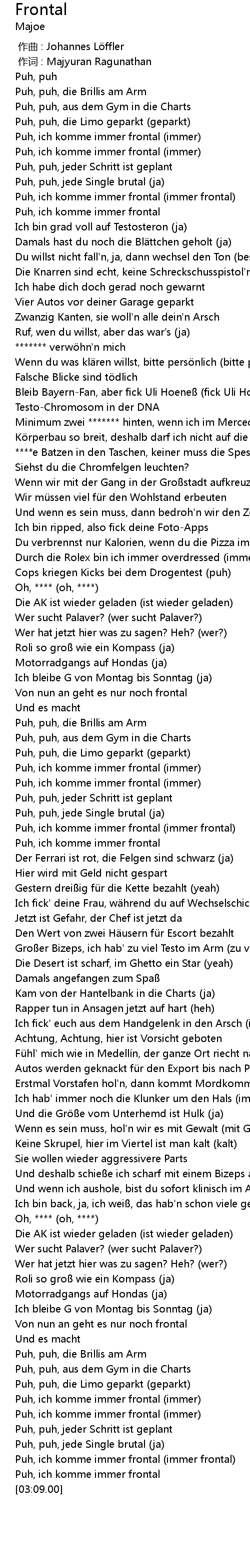 | [03:04.79] | Puh, ich komme immer frontal (immer frontal) |
