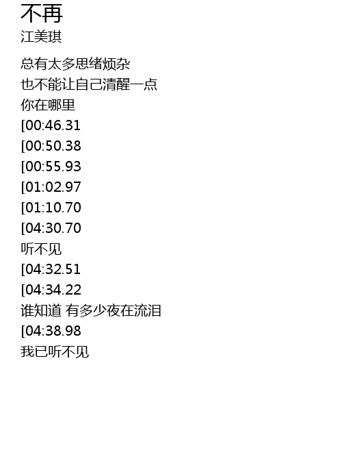| [04:46.19][04:30.70][04:15.04][03:59.25][03:43.77][03:28.10][02:41.68][02:26.13][01:27.29][01:11.65] | zhǎo bu dào tīng bu jiàn |