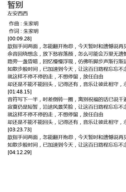 | [01:03.75] | 如散步般时间,已加速到今天,让这百日路程忘忘不念 |