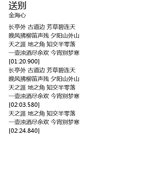 | [01:23.070] | 长亭外 古道边 芳草碧连天 |