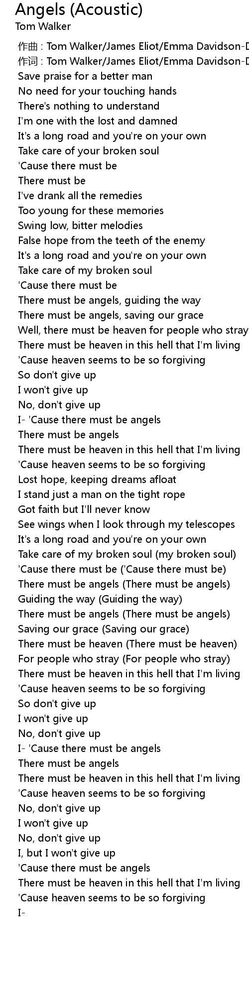 | [00:00.000] | zuo qu : Tom Walker James Eliot Emma DavidsonDillon |