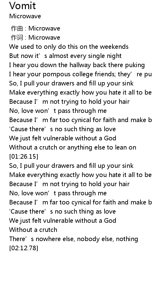 | [00:28.43] | I hear your pompous college friends; they’re puking outside |