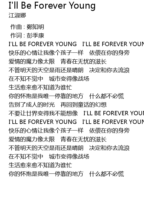 | [01:46.798] | I' LL BE FOREVER YOUNG I' LL BE FOREVER YOUNG |