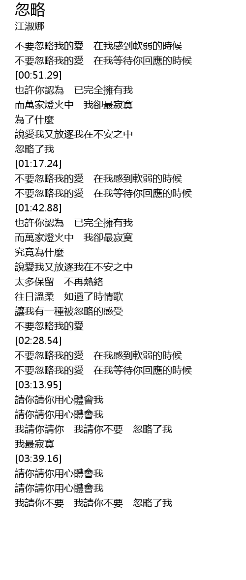| [01:18.79] | 不要忽略我的愛 在我感到軟弱的時候 |