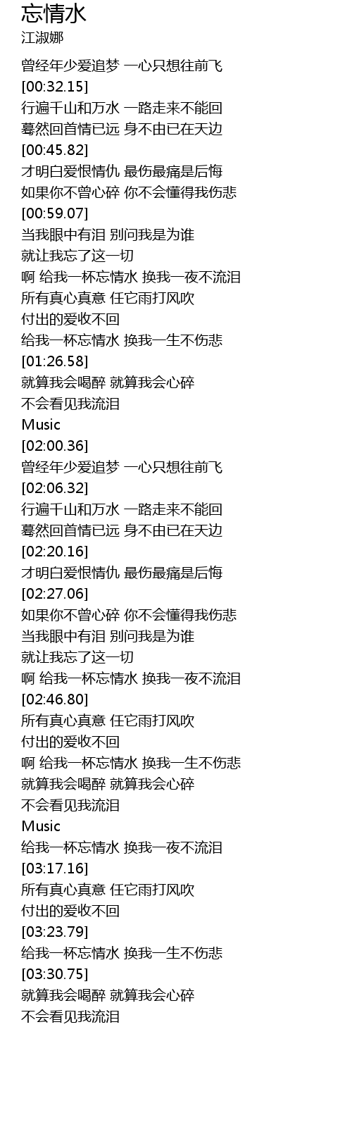 | [03:11.49] | 给我一杯忘情水 换我一夜不流泪 |