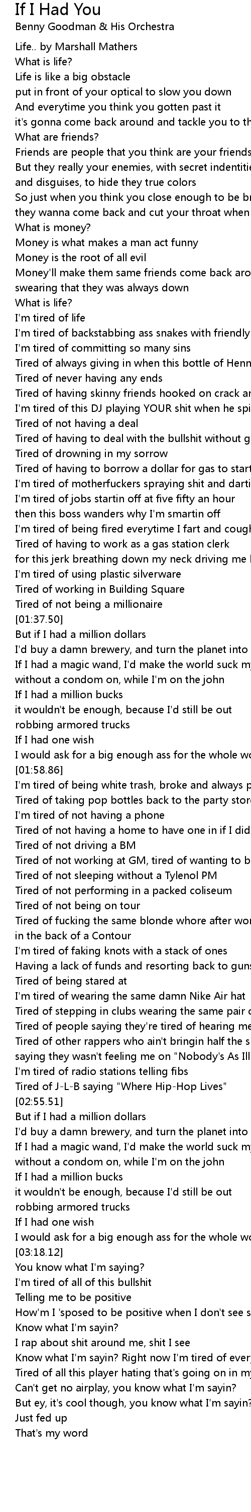 Know what I'm sayin? Right now I'm tired of everything |