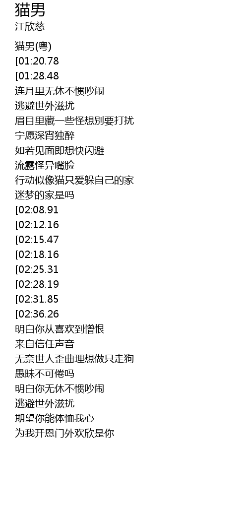 | [00:10.35][01:20.78][03:01.46] | 江欣慈-猫男(粤) |