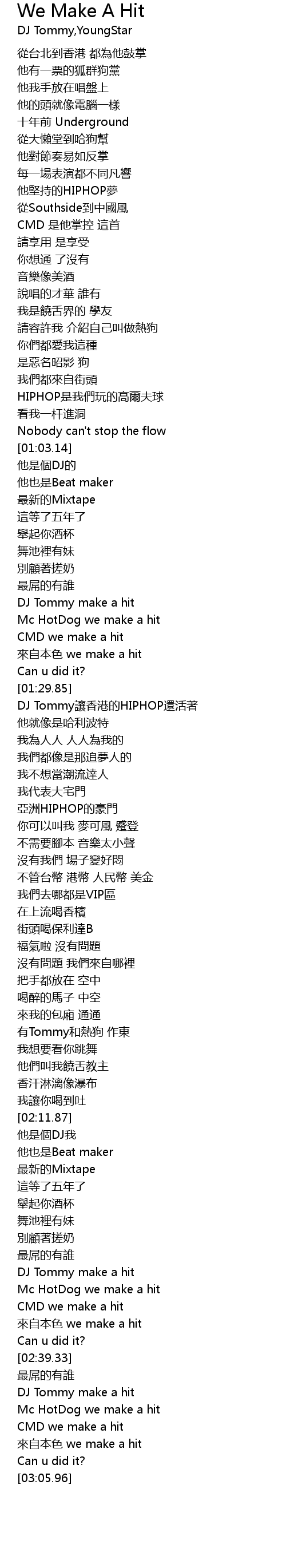 | [01:30.57] | DJ Tommy ràng xiāng gǎng de HIPHOP hái huó zhe |