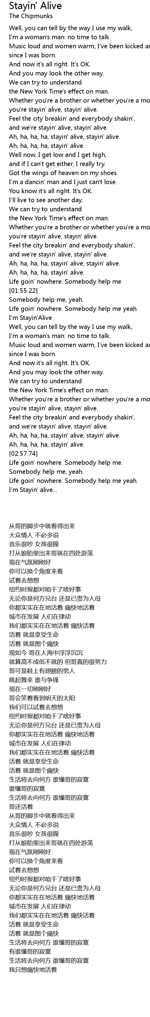 Ah, ha, ha, ha, stayin' alive, stayin' alive. |