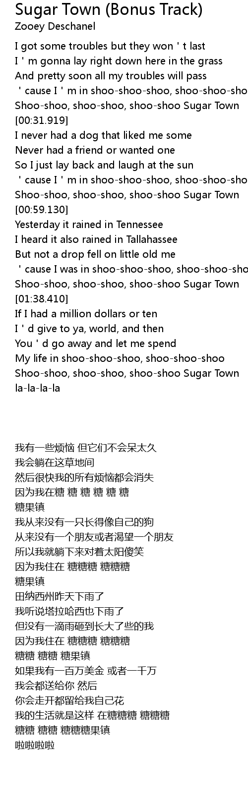| [00:27.110] | Shoo-shoo, shoo-shoo, shoo-shoo Sugar Town |