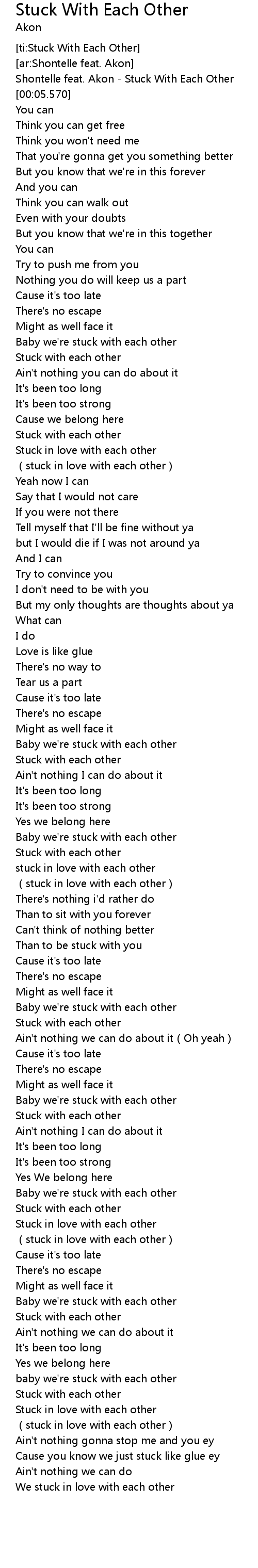 | [00:00.470] | Shontelle feat. Akon Stuck With Each Other |
