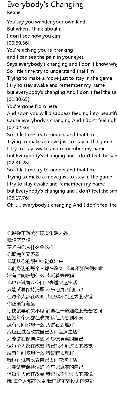 | [03:19.28] | Oh everybody' s changing And I don'' t feel the same |