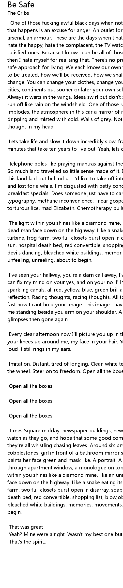 One of those fucking awful black days when nothing is pleasing and everything that happens is an excuse for anger. An outlet for emotions stockpiled, an arsenal, an armour. These are the days when I hate the world, hate the rich, hate the happy, hate the complacent, the TV watchers, beer drinkers, the satisfied ones. Because I know I can be all of those little hateful things and then I hate myself for realising that. There's no preventative, directive or safe approach for living. We each know our own fate. We know from our youth how to be treated, how we'll be received, how we shall end. These things don't change. You can change your clothes, change your hairstyle, your friends, cities, continents but sooner or later your own self will always catch up. Always it waits in the wings. Ideas swirl but don't stick. They appear but then run off like rain on the windshield. One of those rainy day car rides my head implodes, the atmosphere in this car a mirror of my skull. Wet, damp, windows dripping and misted with cold. Walls of grey. Nothing good on the radio. Not a thought in my head. |