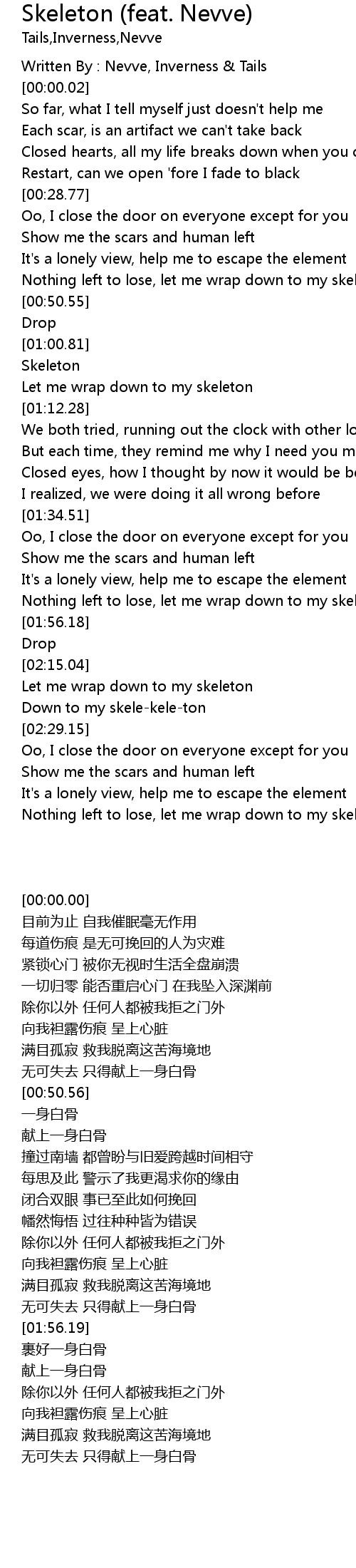 | [01:51.46] | Nothing left to lose, let me wrap down to my skeleton |