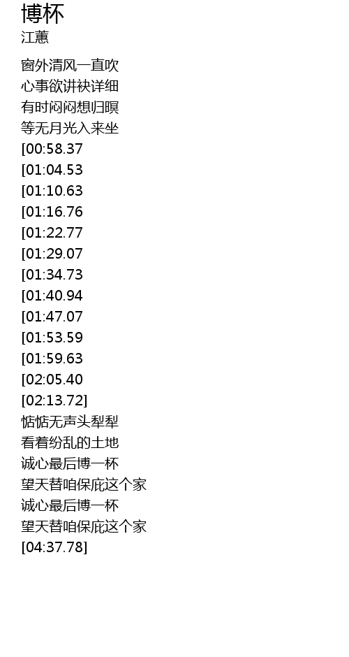| [02:56.95][01:16.76] | zhǐ yǒu bó bēi wèn tiān dì |