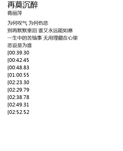| [02:00.56][00:42.45] | 莫再寂寞垂泪 谁愿见你无言憔悴 |
