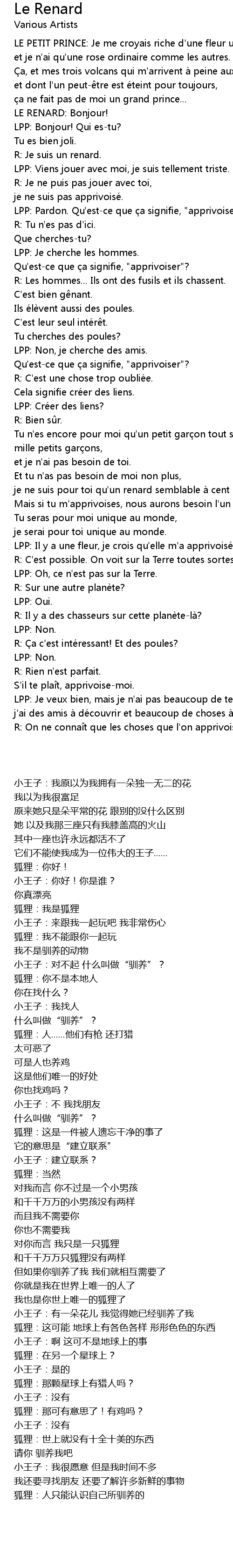 | [01:37.45] | je ne suis pour toi qu' un renard semblable a cent mille renards. |