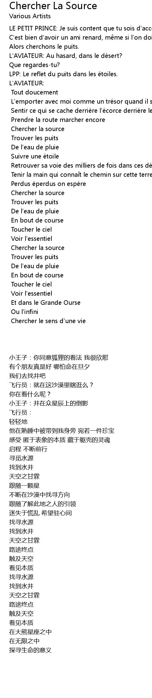| [00:13.00] | L'AVIATEUR: Au hasard, dans le désert? |