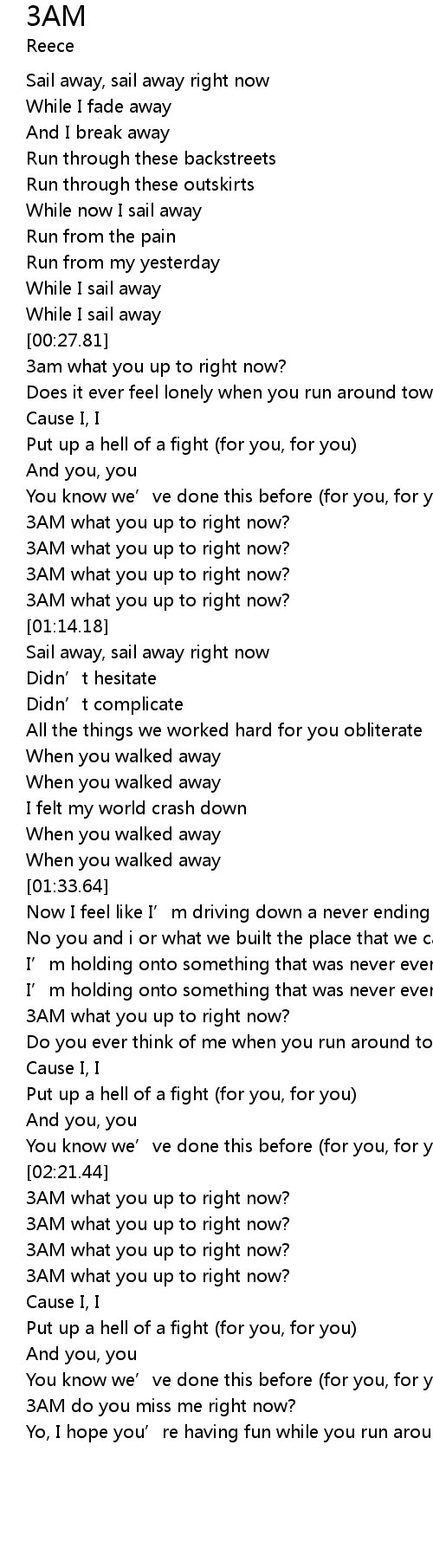 | [01:12.22] | 3AM what you up to right now? |