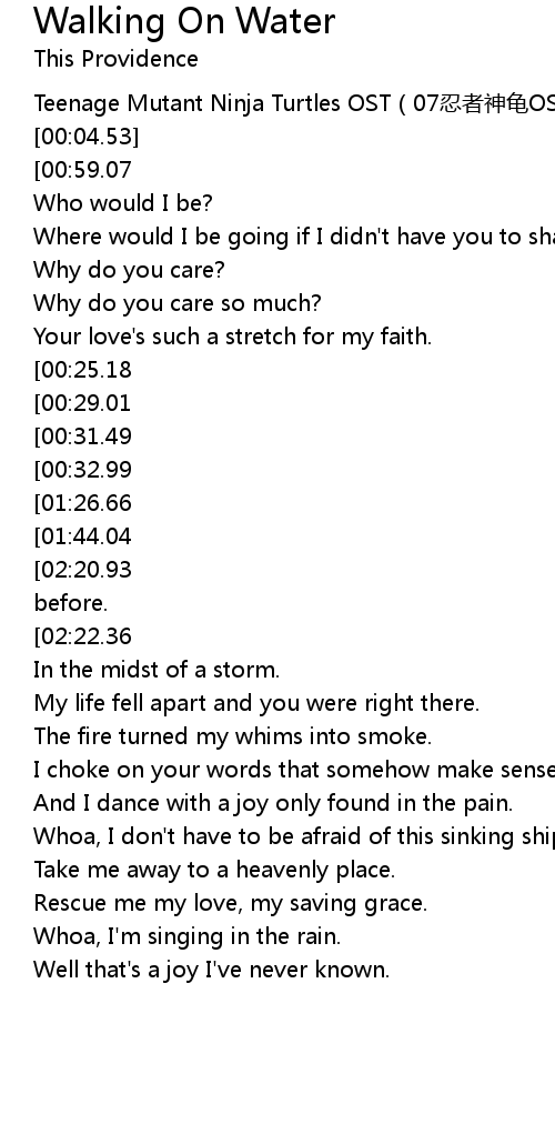 | [02:34.03][02:22.36][01:47.47][01:35.81][00:47.00] | But I'm walking on water now. |