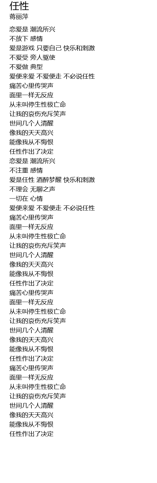 | [01:47.23] | 爱是任性 酒醉梦醒 快乐和刺激 |