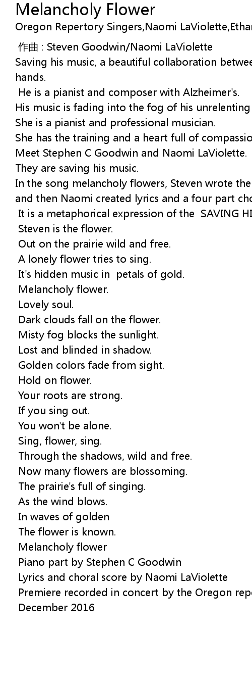 | [00:48.78] | In the song melancholy flowers, Steven wrote the original piano part and then Naomi created lyrics and a four part choral arrangement. |