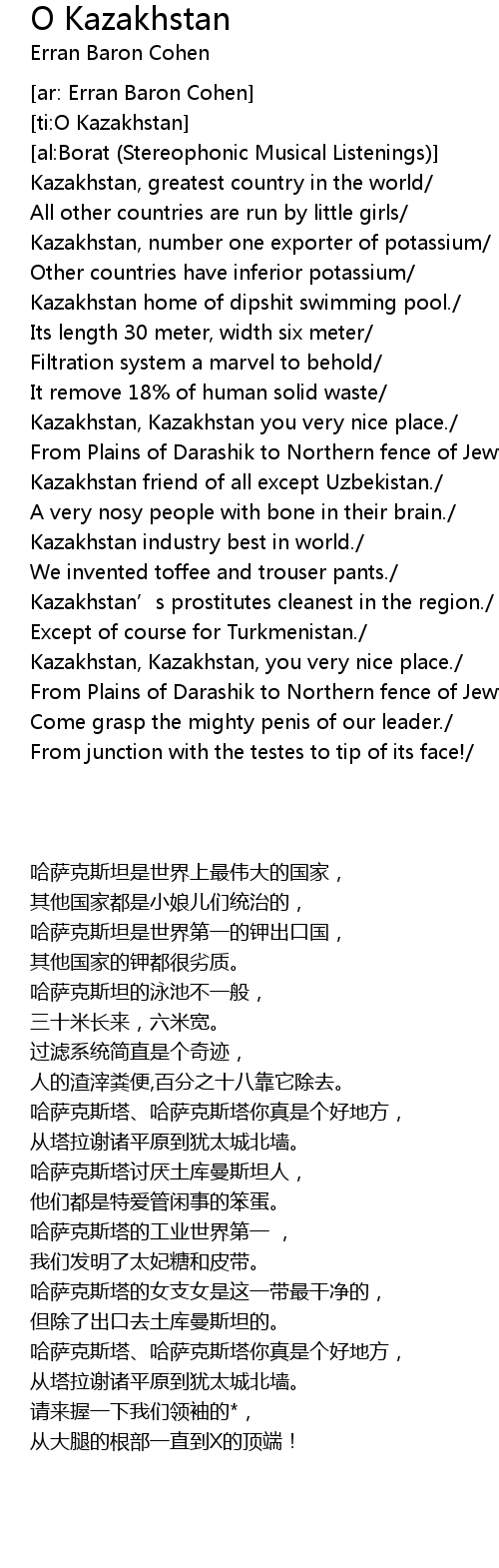| [01:27] | Kazakhstan, Kazakhstan, you very nice place./ |