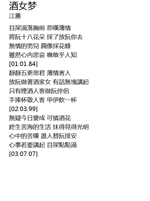 | [01:34.42] | 放阮做著酒家女 有話無塊講起 |