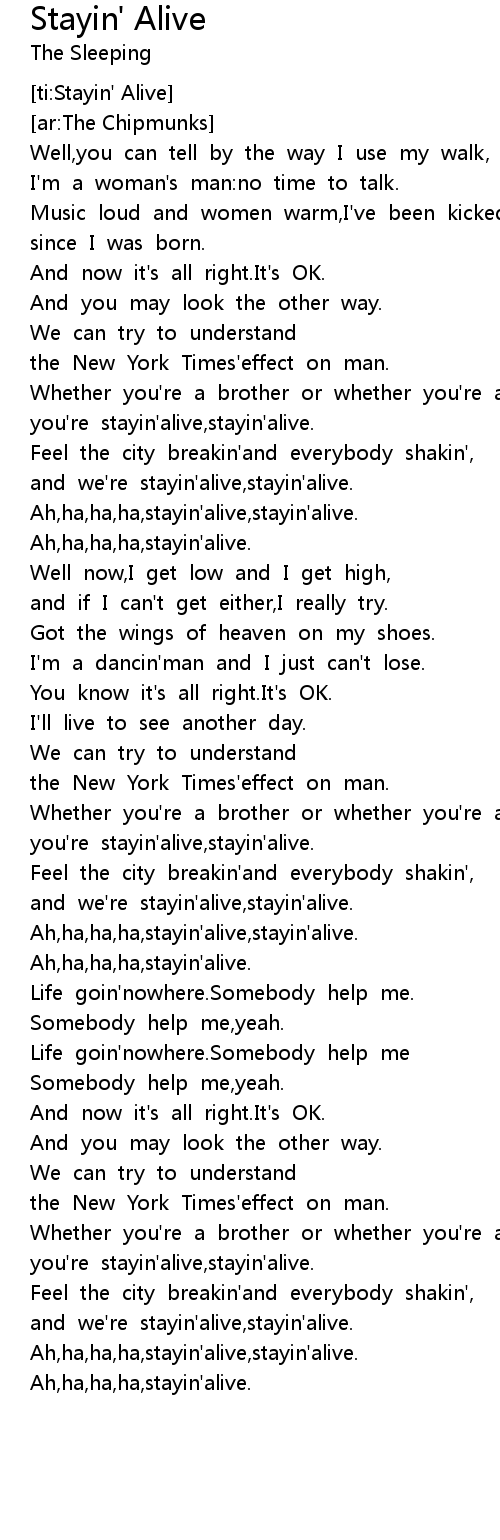Ah,ha,ha,ha,stayin'alive,stayin'alive. |