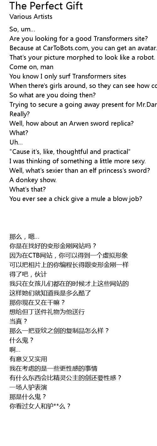 | [00:51.52] | You ever see a chick give a mule a blow job? |