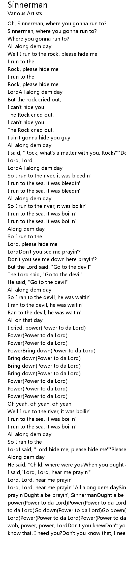 Lord, Lord, hear me prayin'"All along dem daySinnerman you ought a be prayin'Ought a be prayin', SinnermanOught a be prayin'All on that dayI cried, power(Power to da Lord)Power(Power to da Lord)Power(Power to da Lord)Power(Power to da Lord)Go down(Power to da Lord)Go down(Power to da Lord)Go down(Power to da Lord)Power(Power to da Lord)Power(Power to da Lord)Power(Power to da Lord)Oh woh, power, power, LordDon't you knewDon't you know, I need you Lord?Don't you know that, I need you?Don't you know that, I need you?Power, power, power Lord |