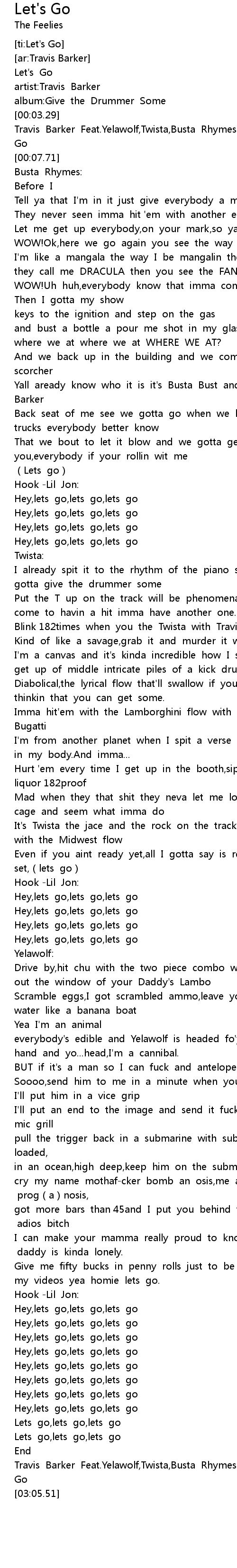 | [00:03.48] | Travis Barker Feat. Yelawolf, Twista, Busta Rhymes Lil Jon Let' s Go |