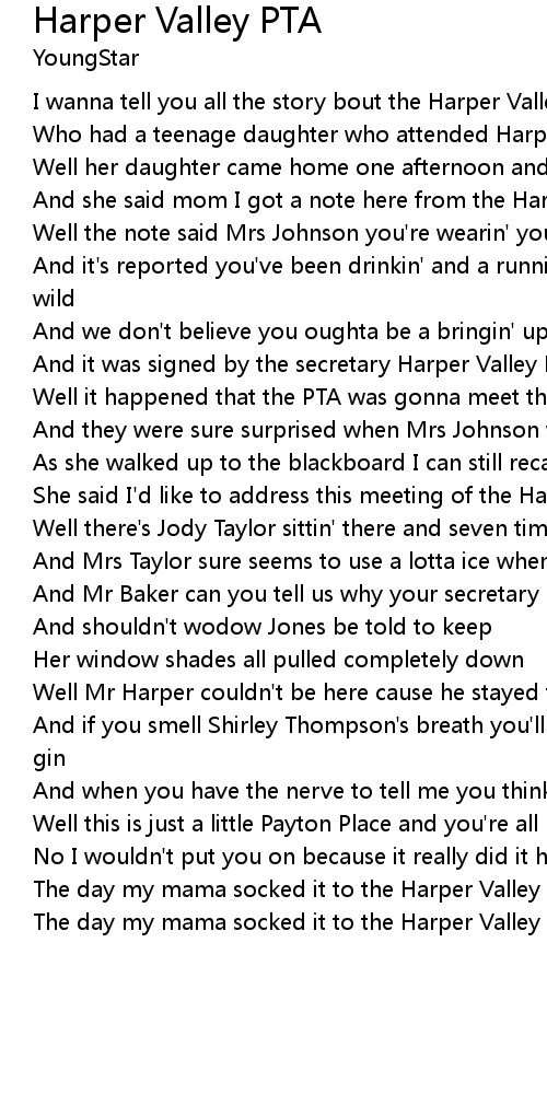 I wanna tell you all the story bout the Harper Valley widow wife |