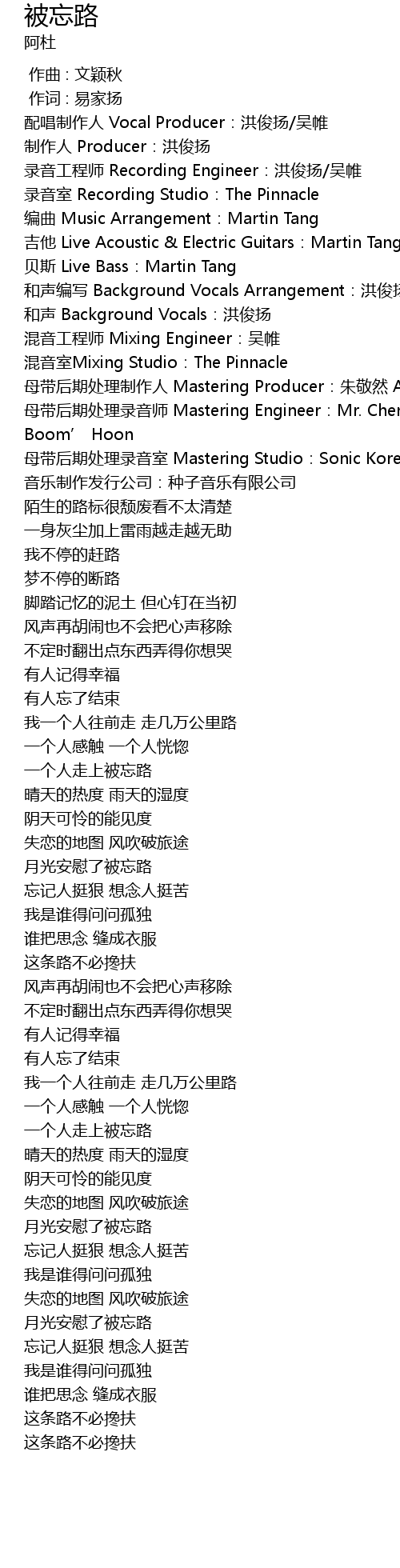 | [00:04.50] | mu dai hou qi chu li zhi zuo ren Mastering Producer: zhu jing ran Andrew Chu |
