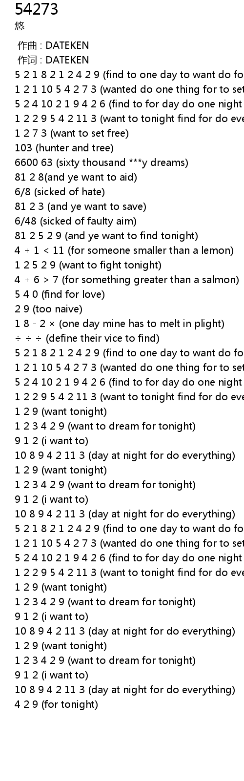 | [02:08.00] | 5 2 4 10 2 1 9 4 2 6 find to for day do one night for to think |