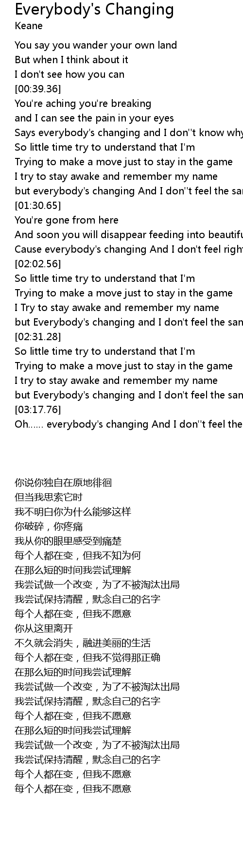 | [03:19.28] | Oh everybody' s changing And I don'' t feel the same |
