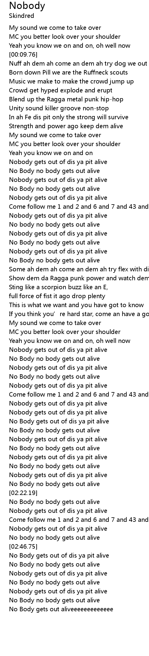 | [01:00.00] | Nobody gets out of dis ya pit alive |