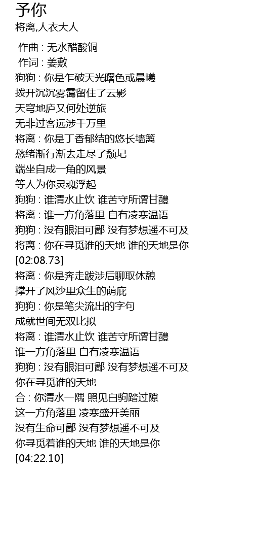 | [01:59.57] | 将离 : 你在寻觅谁的天地 谁的天地是你 |