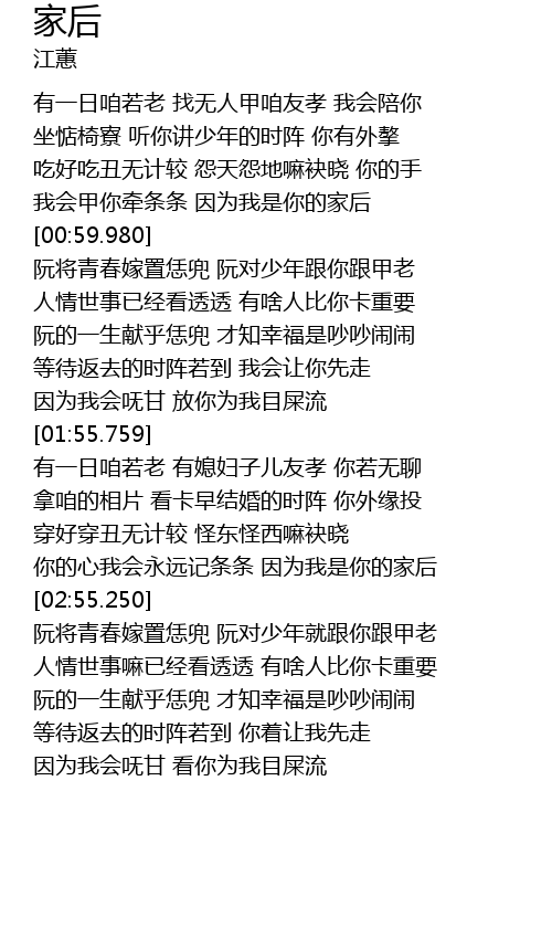 | [00:21.340] | 有一日咱若老 找无人甲咱友孝 我会陪你 |