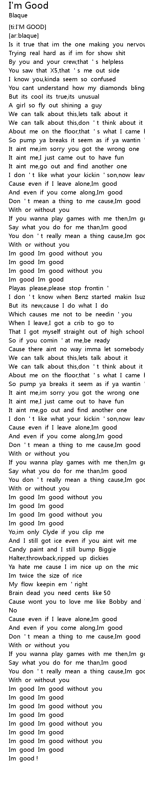 | [00:51.64] | Don t mean a thing to me cause, Im good |